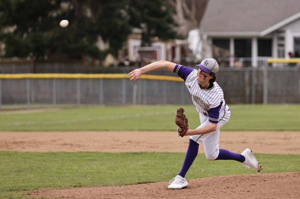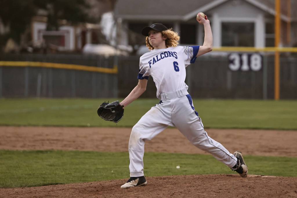 Junior Dylan Michalopoulos of South Whidbey winds up his throwing arm during an island-wide jamboree in Oak Harbor March 11. The event was the first of the season. The Falcons will be playing a double header on home turf this Saturday against Bellingham. (Photo by John Fisken)