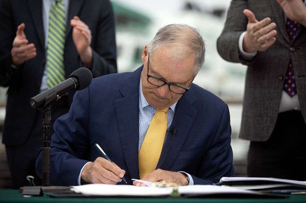 The governor held two signing ceremonies on Friday, one in Mukilteo in the morning and another later in the day at Tacoma. At both stops he touted the climate and clean energy elements in the transportation measures.