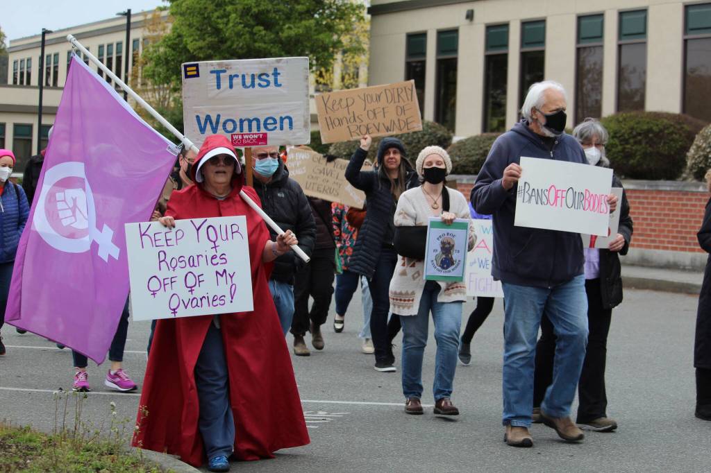 Whidbey protesters sporting signs bearing messages such as “Bans off our bodies” and “We are not ovary-acting” marched around the block near the courthouse. Though it was a quiet afternoon in Coupeville and few cars or pedestrians passed by the site of the small gathering, organizers and attendees said they hope their actions will spark a larger conversation in the community.