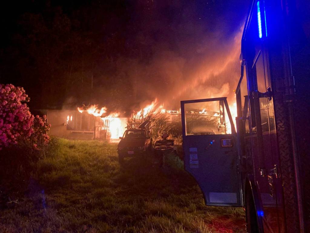A residential fire engulfs a North Whidbey home, two vans and a boat early Thursday morning. (Photo by North Whidbey Fire and Rescue)