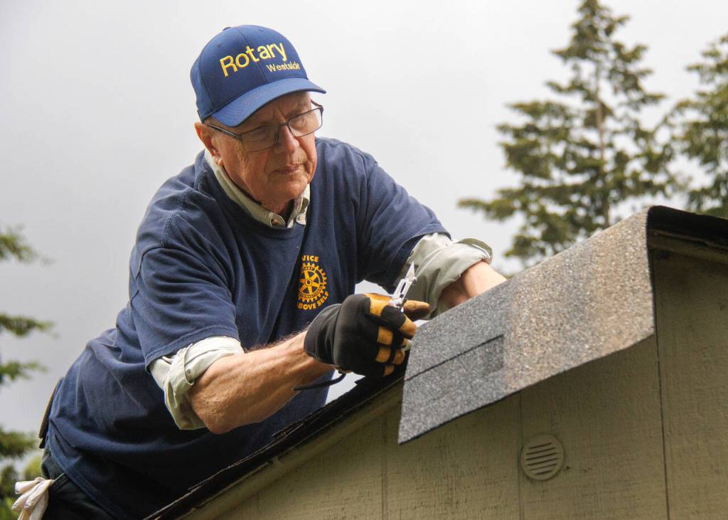 Jim Rogers of Rotary Club of Whidbey Westside reroofs a storage shed at the House of Hope.