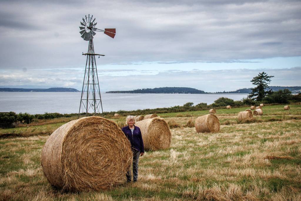 Pat Powell swept her arm around a landscape of rolled hay bales in a farm field with Admiralty Bay and the Olympic Peninsula in the background.