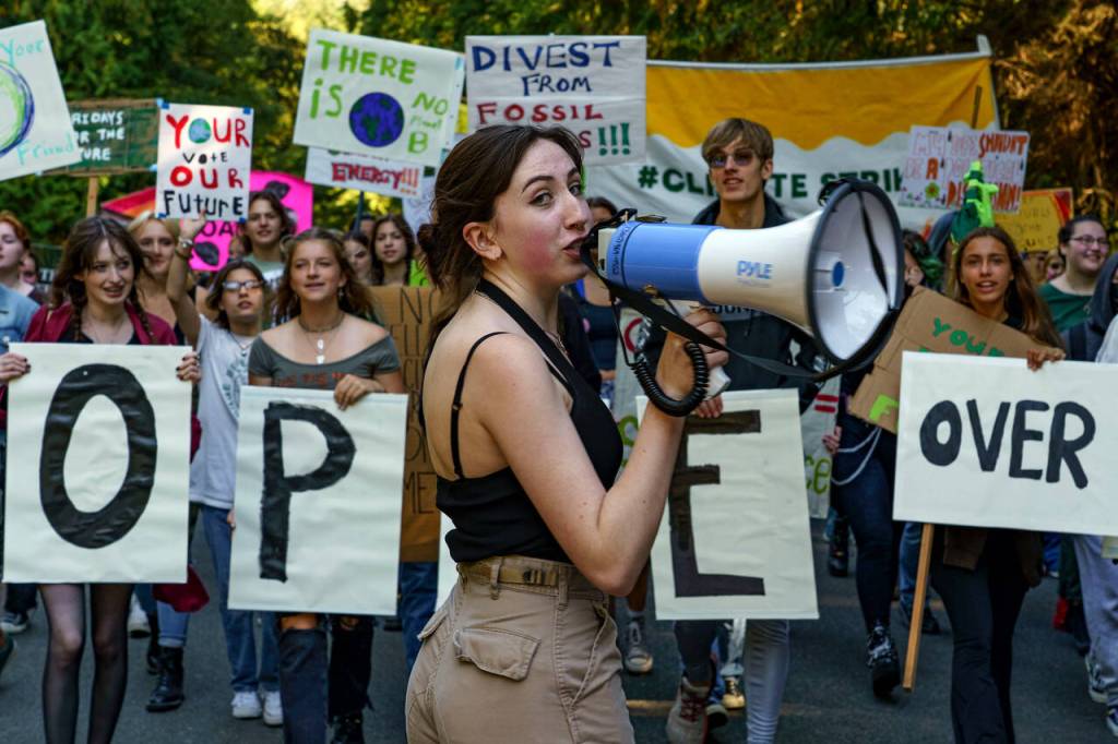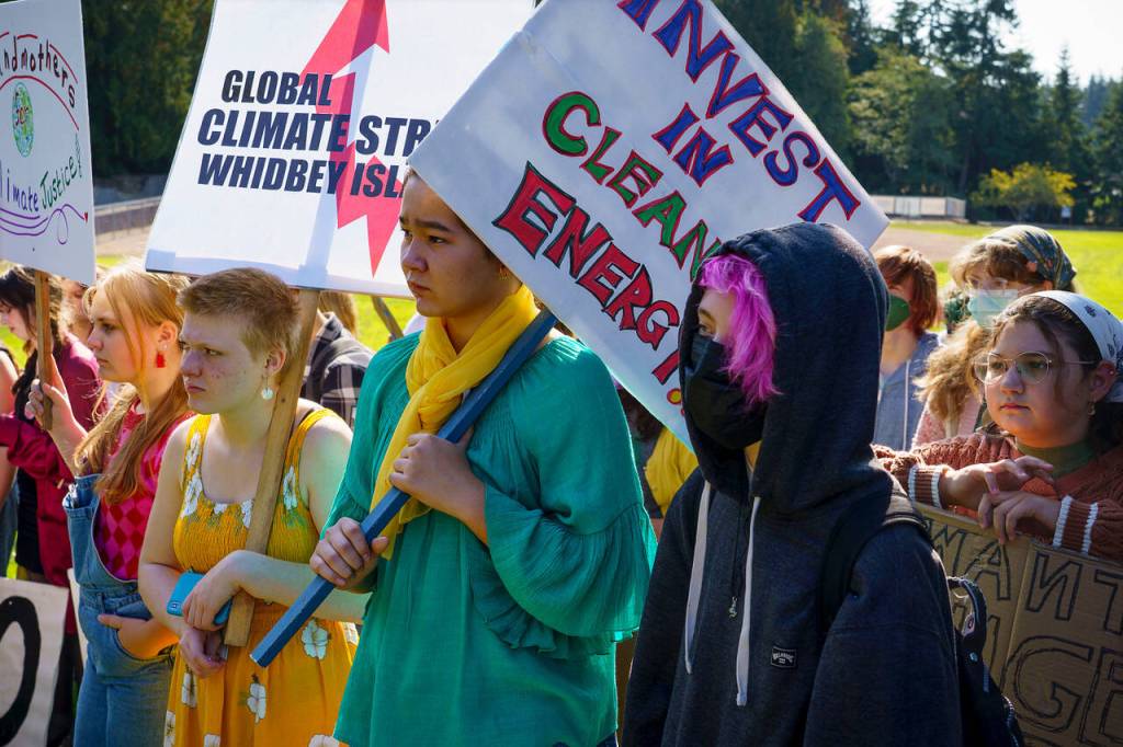 Nearly 100 South Whidbey students left school early on Friday to rally for climate action.