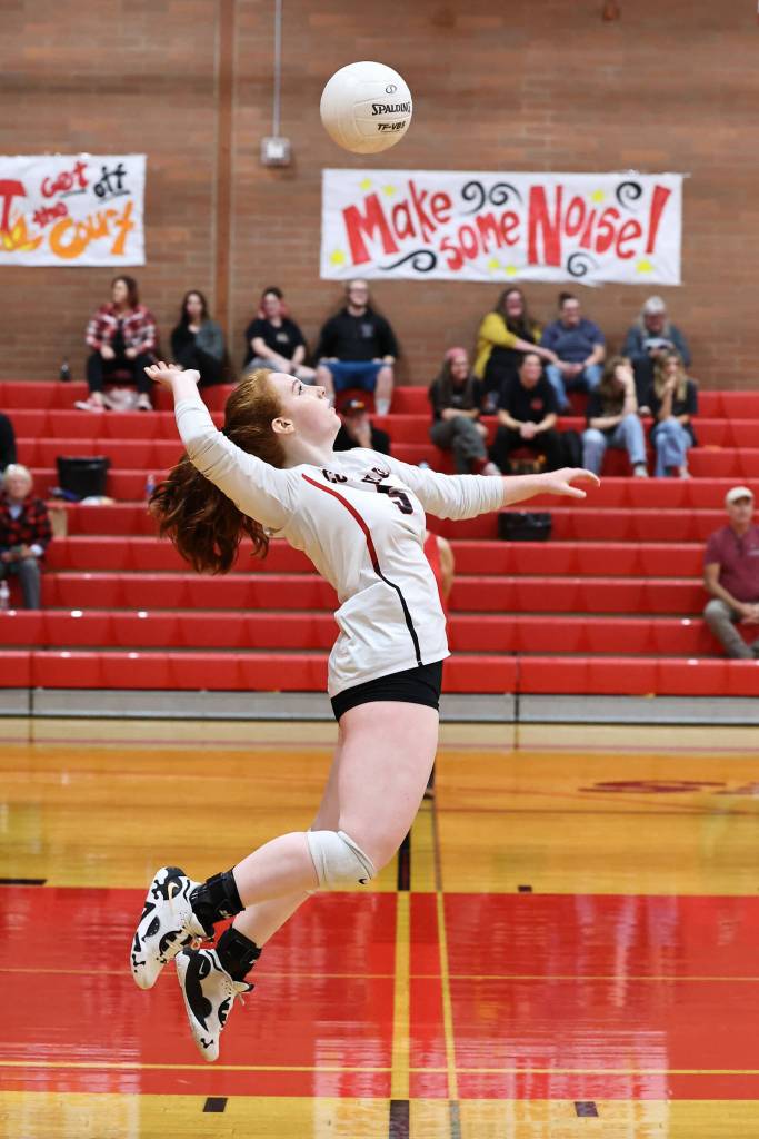Coupeville athlete Taygin Jump competes in the Oct. 15 match against Neah Bay. Coupeville defeated Neah Bay 3-1. Coupeville High School’s varsity volleyball team is 8-3 overall this season.
