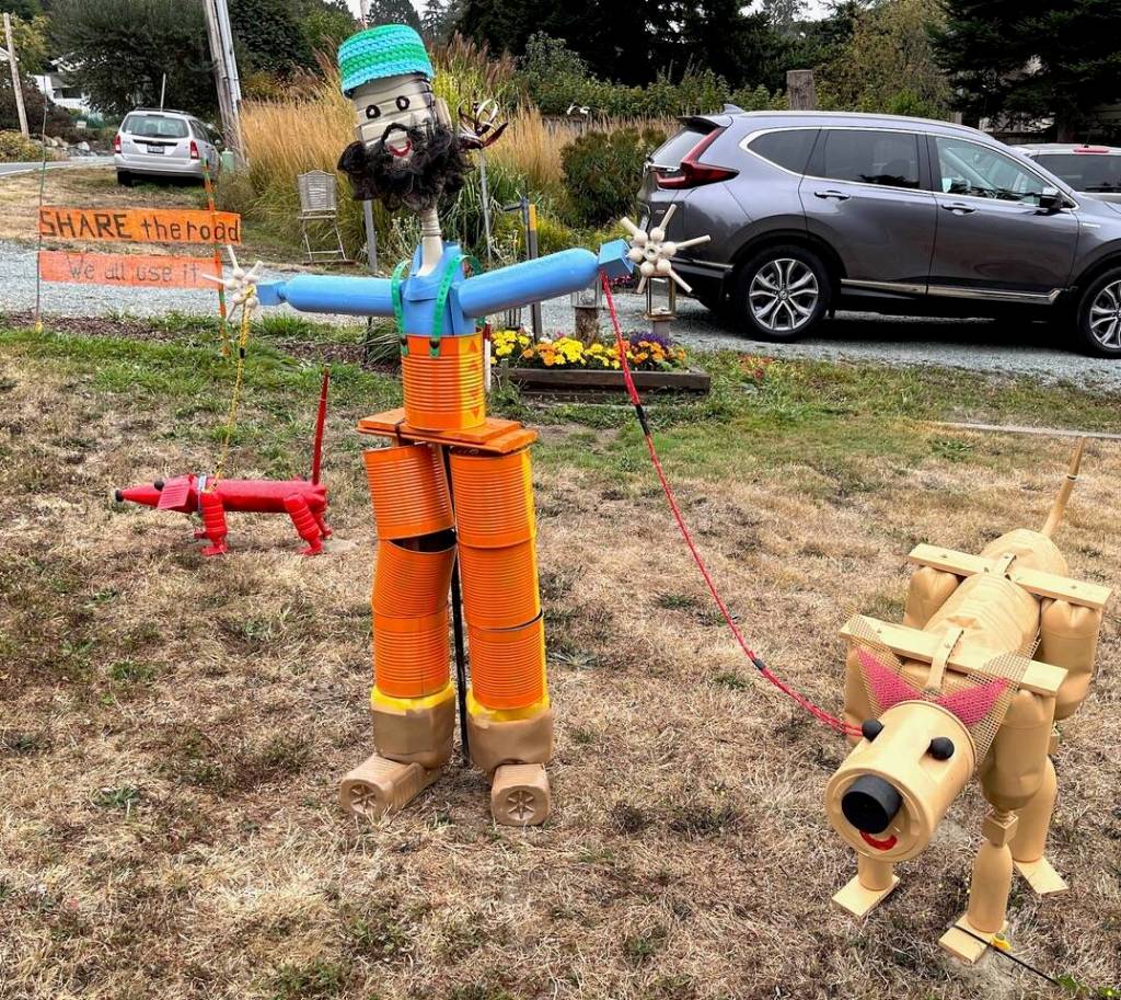 And now, ensconced in her cozy new home with her two-year-old Scottie dog named Mr. Tuggins (because he likes to tug rugs), Nancy has also resumed her career as a graphic artist — but in a very unusual way. She makes “statues” out of plastic cross-stitch frames and a variety of recycled household goods from colanders to coffee cans. “I really didn’t want to spend much money except for some spray paint.” She’s put up four so far at various sites along the roads on Central Whidbey.