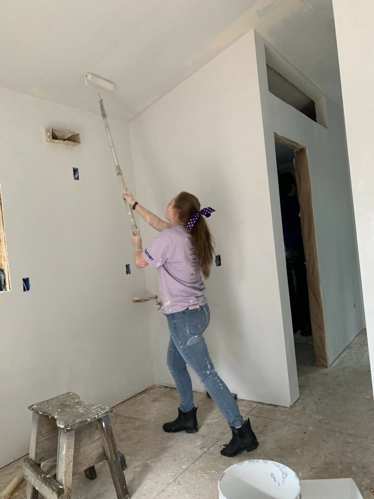 Courtney Williams from Oak Harbor paints the interior of one of the Langley tiny homes.
