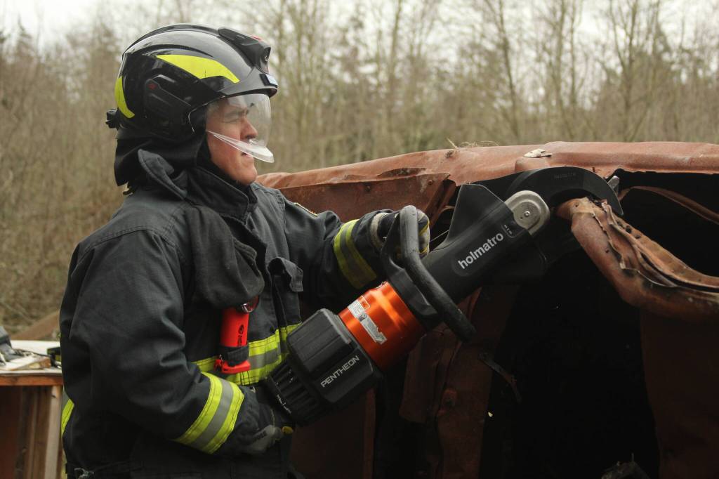 Central Whidbey firefighter Jeff Rhodes participates in a vehicle extrication training Feb. 9.