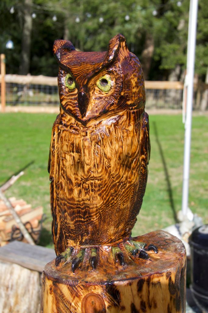 Jim Latham wanted to know if Boesch had seen an article in the News-Times about how he and his wife rescued the owl. He proposed that Boesch memorialize the event in wood by creating a chainsaw sculpture of the bird. Boesch, who had taken up the hobby a couple of years earlier, gladly agreed.