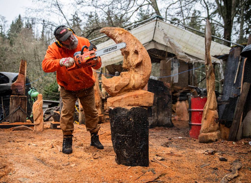 ‘Carve or Starve!’: Whidbey’s godfather of chainsaw art rebounds from fire