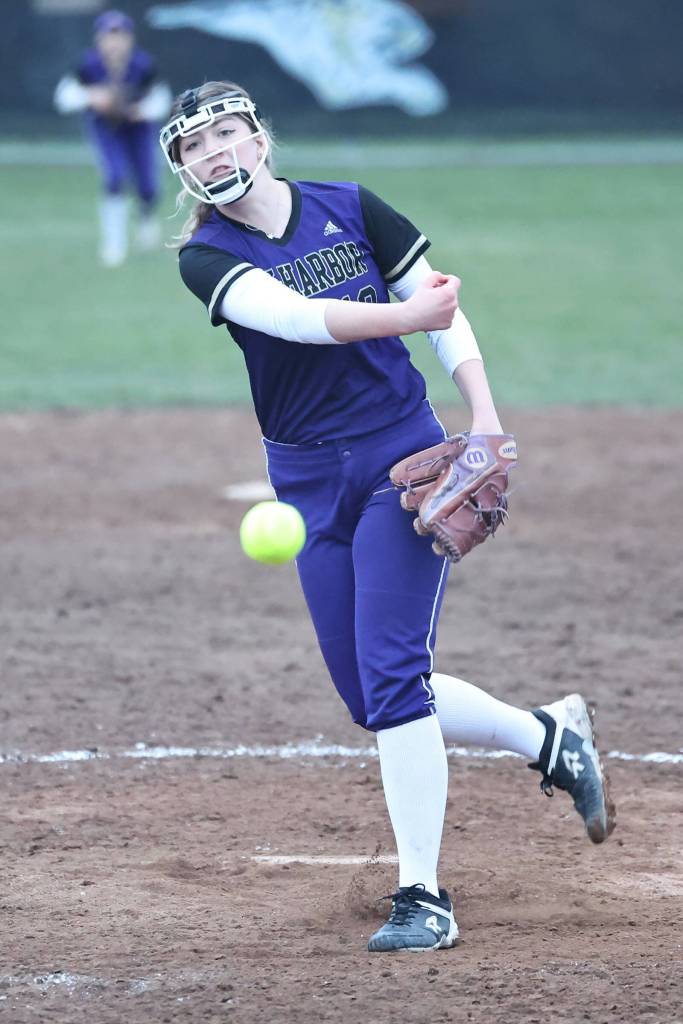 Oak Harbor athlete Reese Wasinger throws the ball during a varsity softball game March 10. Wasinger claimed the win as the pitcher, striking out three batters, allowing one hit and one earned run.