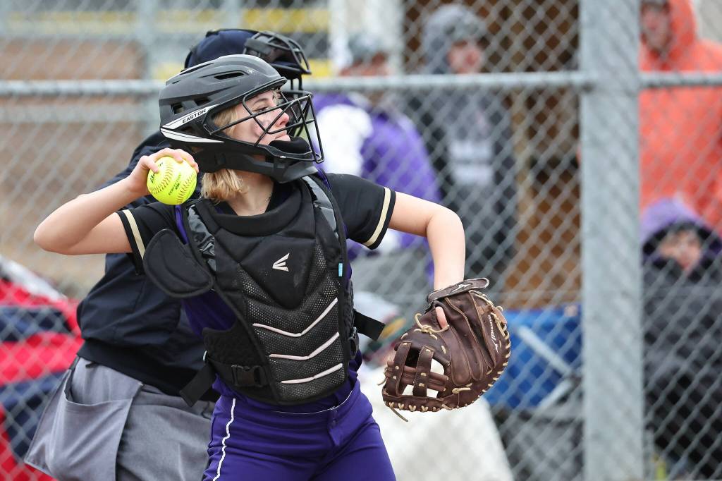 Oak Harbor athlete Lilly Norman lobs the ball during a varsity softball game March 10. Oak Harbor High School hosted the Coupeville and South Whidbey high school softball teams. The Wildcats played both schools in two mini three-inning games. The Wildcats beat the South Whidbey Falcons 7-1. Oak Harbor’s game against the Coupeville Wolves stopped after one and a half innings due to sunset. The Wildcats were in the lead 6-2.