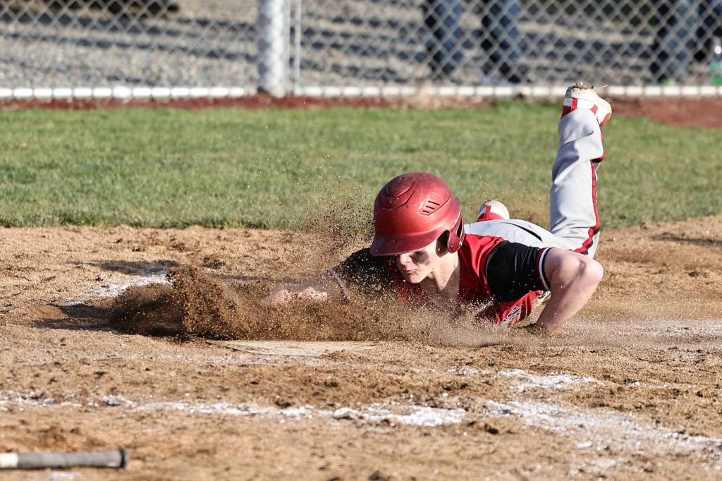 Coupeville High School freshman Aiden O’Neill, slides into a base during a game against South Whidbey High School March 15. Coupeville beat South Whidbey 13-2 in the baseball season opener.