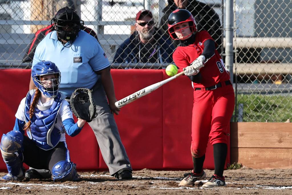 Coupeville High School sophomore Taylor Brotemarkle, the team’s starting shortstop, takes a swing in a softball game against South Whidbey High School March 15, while South Whidbey sophomore Josalynn Jaeger-Funcannon catches.