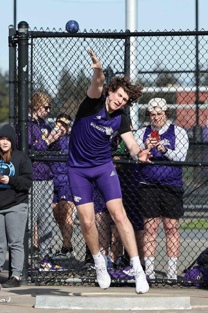 Barrett Schmall throws a shot put ball at a March 19 track meet against Burlington. The Oak Harbor High School varsity boys team won 83 to 62. (Photo by John Fisken)