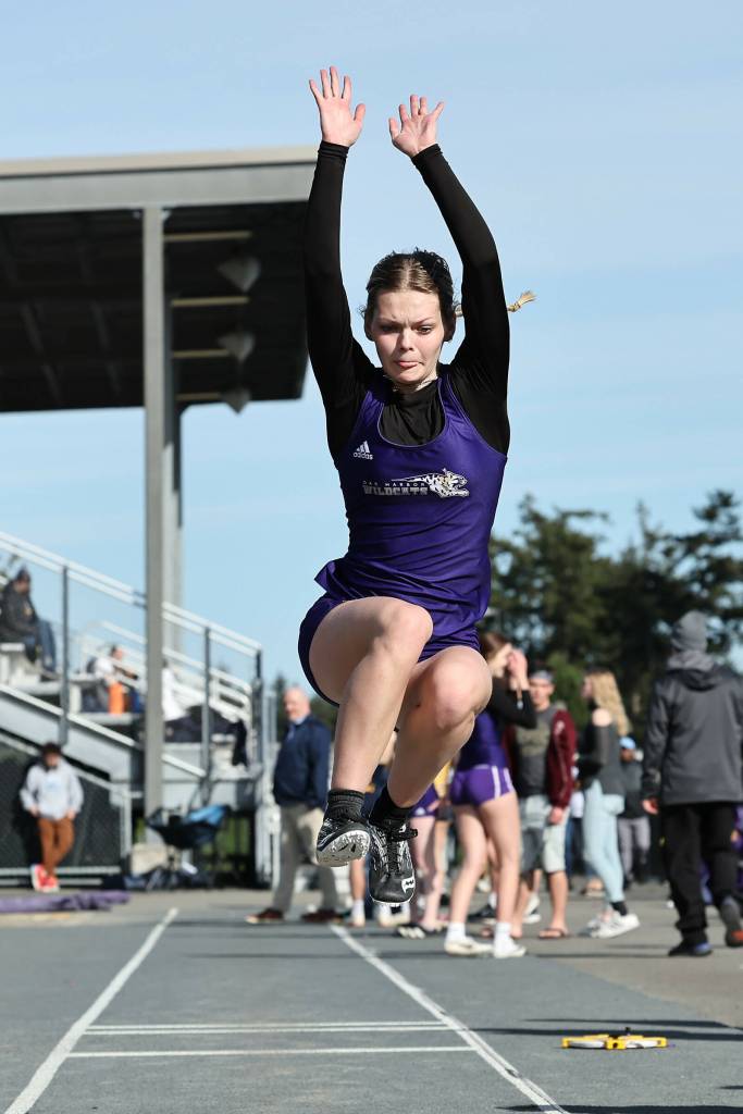 Verity Merth lands a jump at a March 19 track meet against Burlington. The Oak Harbor High School varsity girls team won 96.83 to 53.16. (Photo by John Fisken)