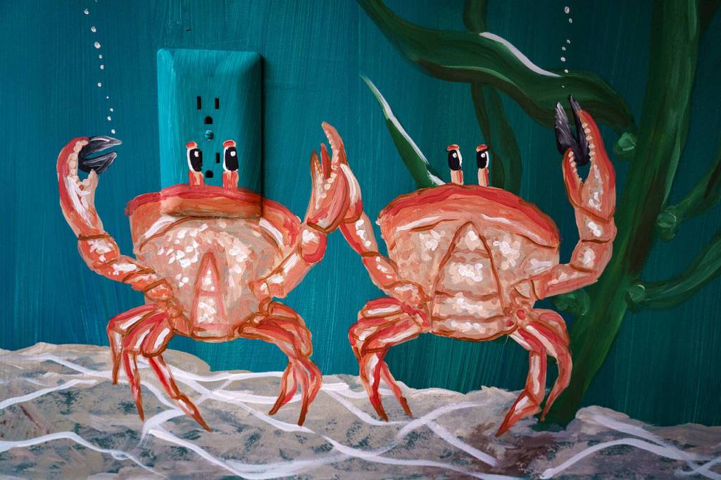 Using a rough sketch doodled by Knowlton in green ink, Sarver painted an underwater marine scene replete with smiling porpoises, dancing crabs holding mussels as castanets and a school of salmon madly swimming away from a hungry orca licking its chops.
