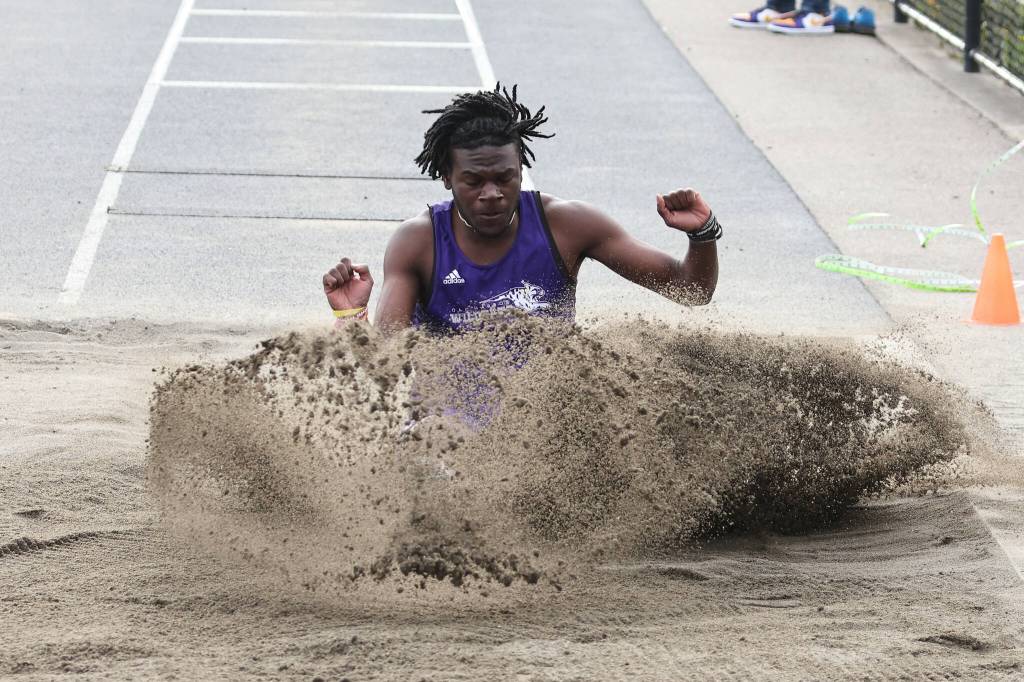 Oak Harbor athlete Michael Johnson-Howard sticks a landing at a track meet against Lynden Christian and Bellingham April 26. Johnson-Howard ranked first in both long jump and triple jump at the meet. Both the boys and girls teams dominated the meet. The boys team scores were Oak Harbor 93, Lynden Christian 41 and Bellingham 17. The girls team scores were Oak Harbor 70, Lynden Christian 51 and Bellingham 37.