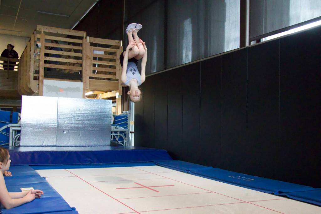 The Flyers compete on trampoline, double mini and tumbling on a rod floor.
