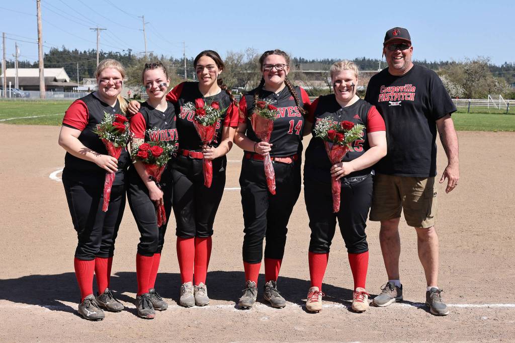 From left, seniors Maya Lucero, Gwen Gustafson, Melanie Navarro, Sofia Peters and Allie Lucero and Coach Kevin McGranahan celebrate senior night at a softball game against La Conner Saturday afternoon. The Wolves won 17-2.