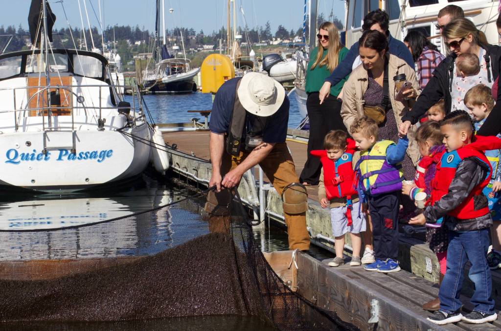 A small gathering of children, parents and other onlookers crowded onto a dock at the Oak Harbor marina to witness the release of 30,000 juvenile salmon into the wild.
