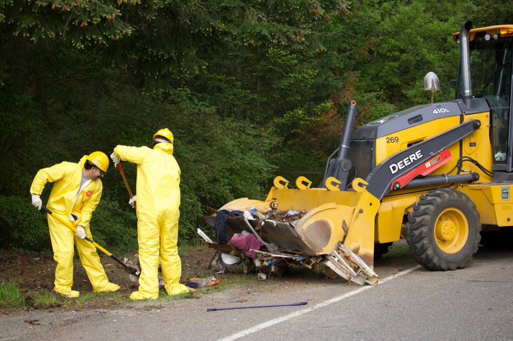 Several heavy equipment vehicles lifted garbage into large dumpsters. Island County Public Works employees, dressed in hard hats and yellow hazmat suits, collected smaller items with shovels. Clothes, furniture and the remains of a burnt-out trailer were among the trash hauled off.