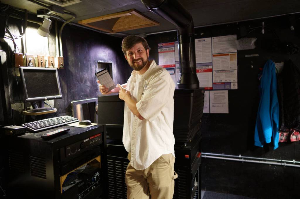 Blake Willeford stands beside the projector that The Clyde Theatre used to show films until moving to a digital format in 2011.