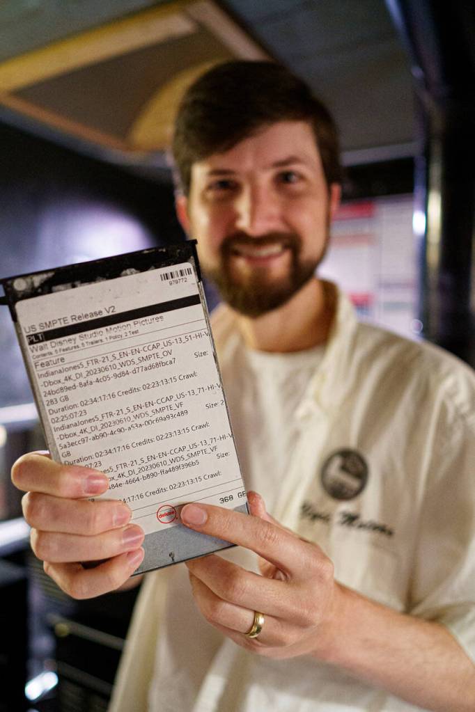 Brook Willeford holds up an external hard drive containing “Indiana Jones and the Dial of Destiny.” The majority of movies shown at The Clyde these days come in this form.