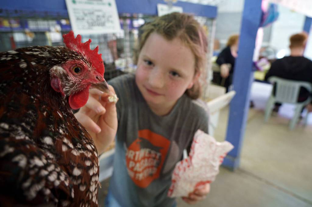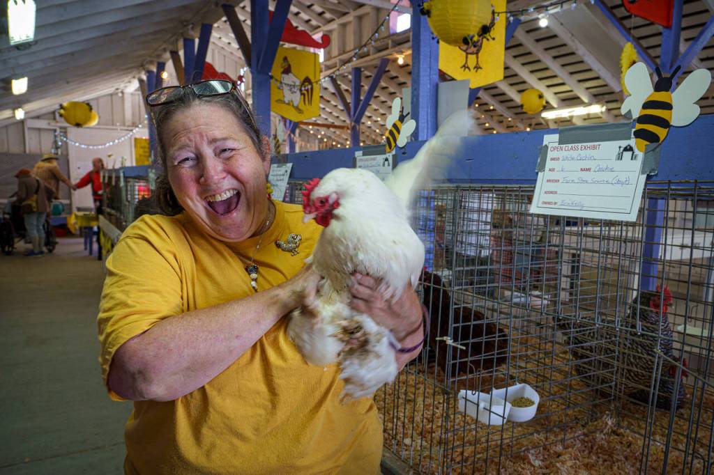 Competitors in the chicken barn had much to crow about when it comes to their fowl. Erin Kelly, who competes in open class, shared the story of her white cochin hen. The bird has thick white feathers, even on her legs.