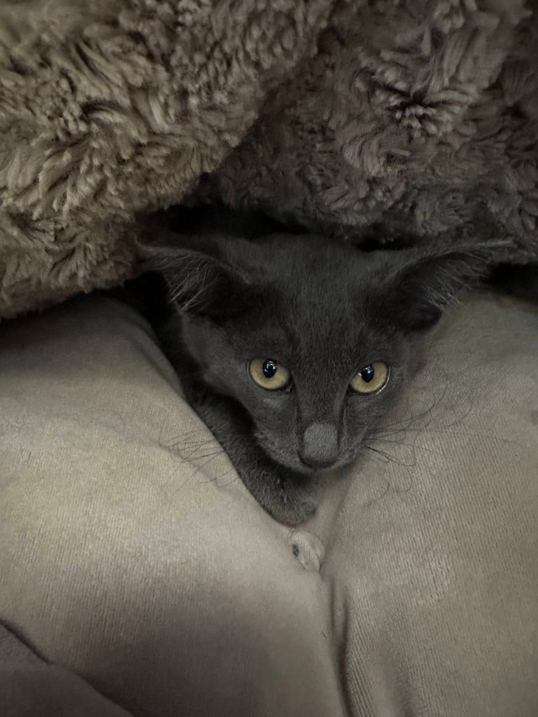 Patrin started referring to the 4-month-old kitten as Bosun, a term meaning a ship’s officer in charge of equipment and the crew. Bosun’s temperature was brought up slowly with a warm water bath that also cleansed him of the diesel and grease left behind on his body from the boat.
