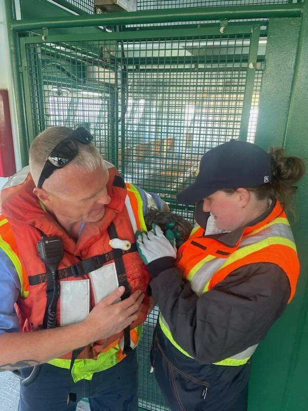 Luckily, curiosity did not kill the cat, which fell into the cold water but was swiftly scooped up by the Kitsap crew’s rescue vessel that was deployed around 8:15 a.m. The kitten was found clinging to the pilings of the adjacent wing wall. It was transported to South Whidbey Animal Clinic in Clinton.