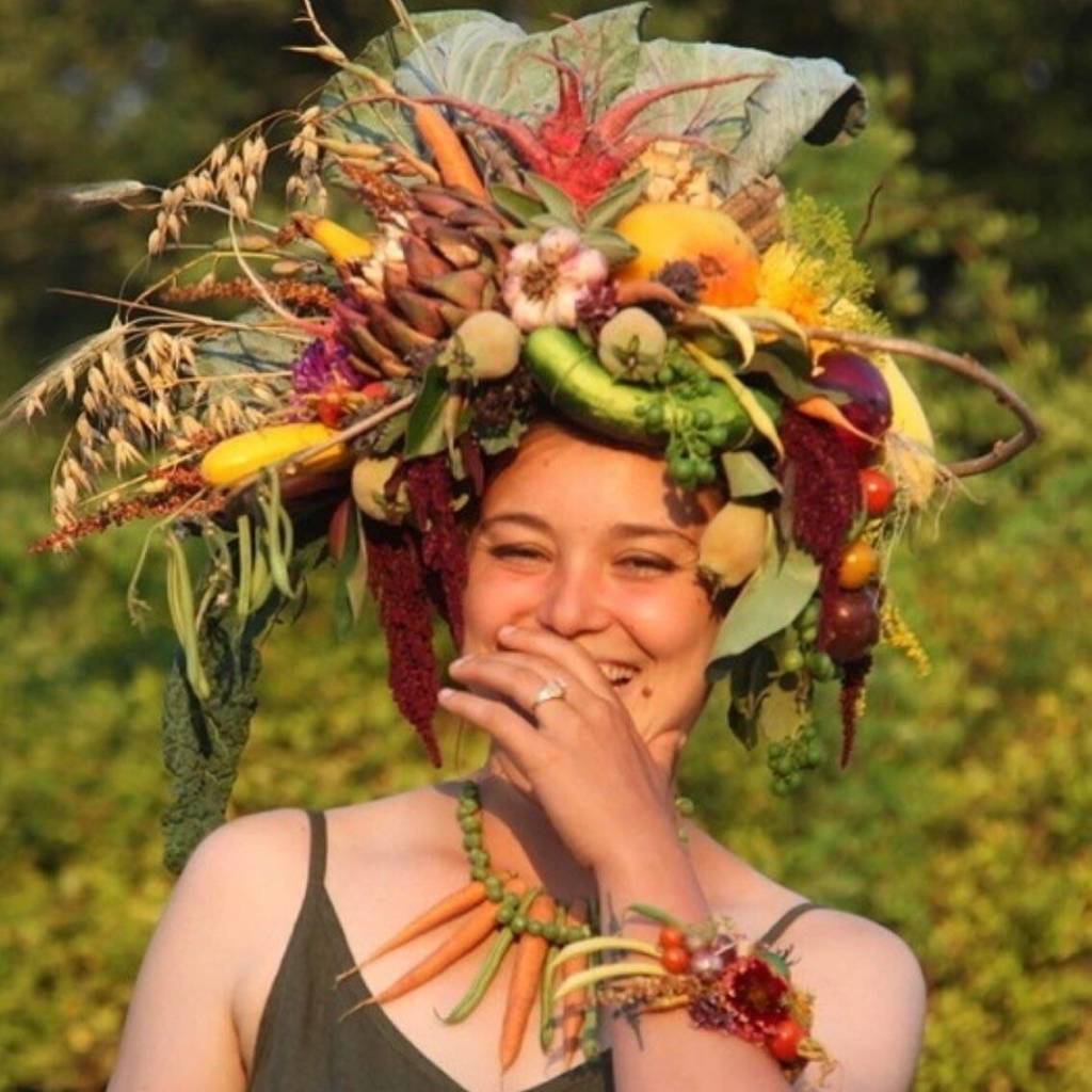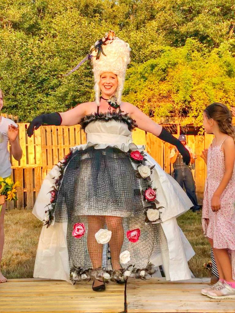 At the first Farm Fashion Show, attendees expressed a desire to take a spin on the catwalk themselves. Bentsen drew inspiration from a wearable art show in Port Townsend; she showed up in a dress made of seed packets. Another model dressed up as Marie Antoinette and wore a dress made of chicken wire. People also went “full Whidbey” and crocheted their own clothes, Bentsen said. One memorable entrant showed up with an owl sculpture at the end of a 20-foot shovel.