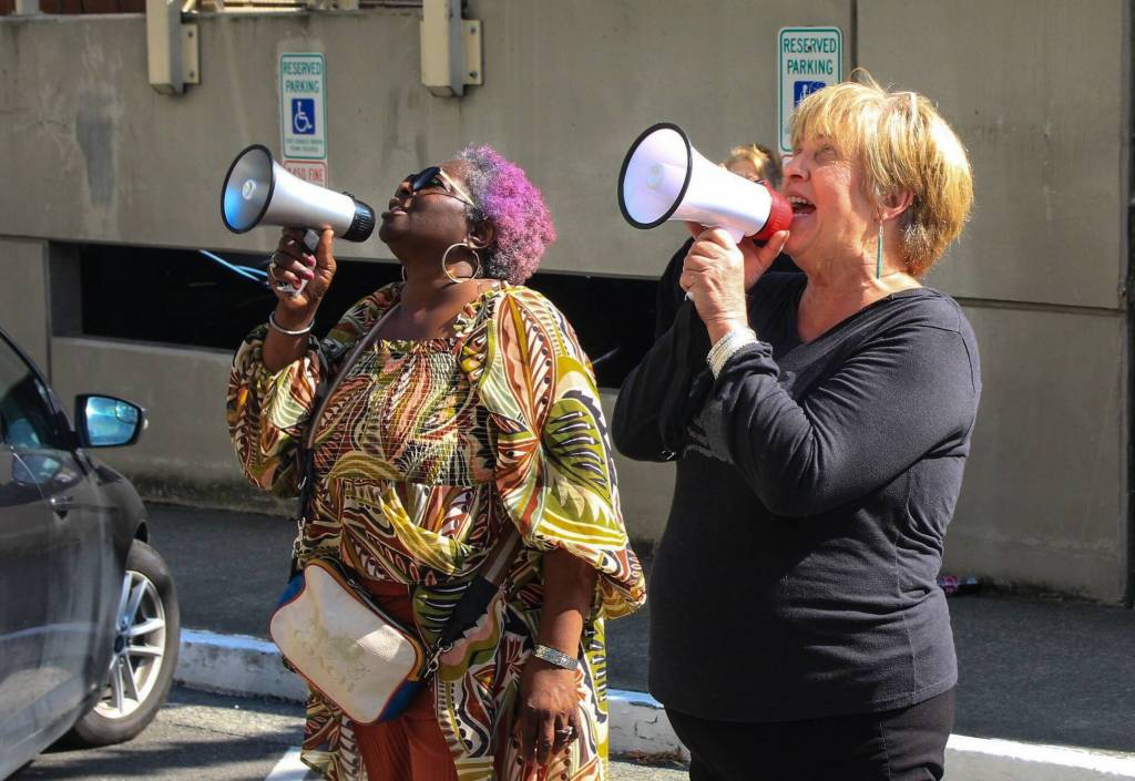 Langley resident Patrice Huth grabbed her megaphone as the people around her held signs and played the drums.