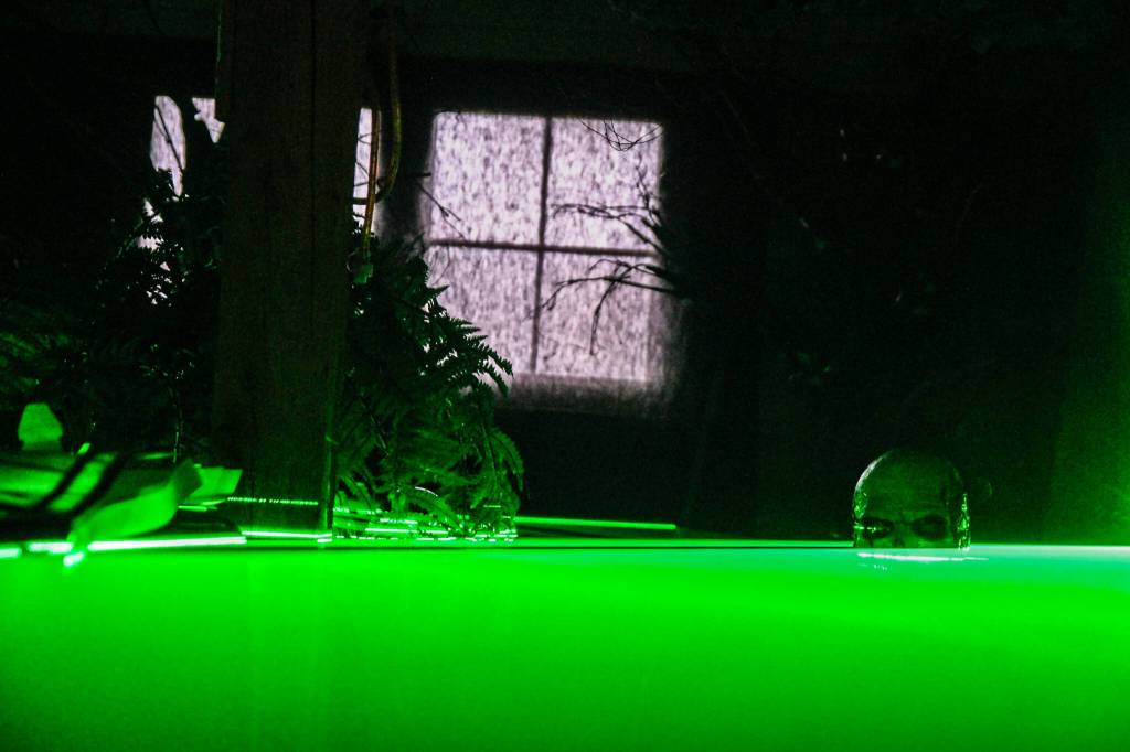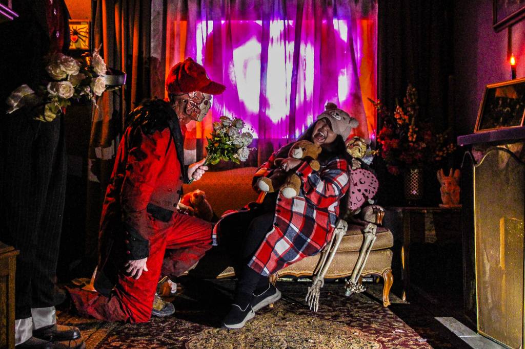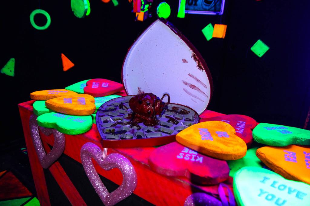 Many of the over 25 rooms, inspired by phobias, have remained the same since the last Halloween haunted house but are saturated with cutesy Valentine’s Day decor. Once inside, couples will go through nightmare settings, such as a daycare for zombie babies, a bloody tattoo studio and a swamp with fog so thick it hides any danger beneath it.