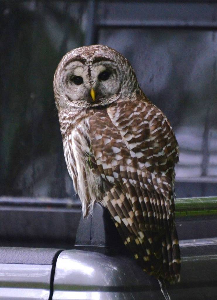 A barred owl sits on a pick-up truck in Coupeville. (Photo courtesy of Martha Ellis)