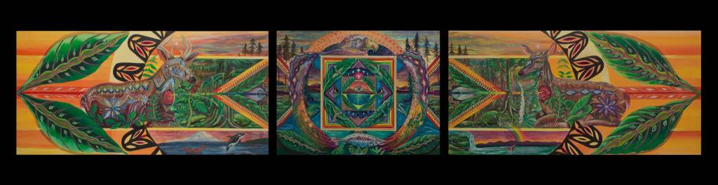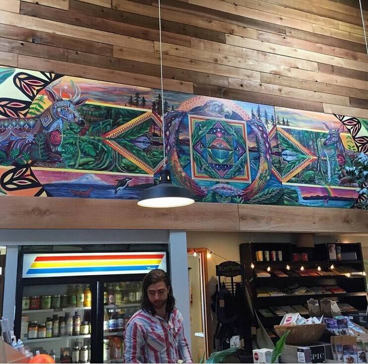 The mural is a busy spectacle of color and shapes, weaving Oregon grape, cedar trees, Devil’s club, foxglove and nettle through a landscape flanked by two blacktail deer. An orca leaps from the water, and a bald eagle anchors the centerpiece, symbolizing the heart of the landscape: a bridge between sky and water.