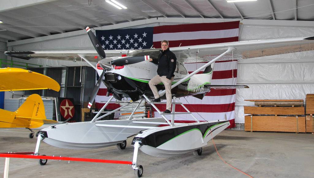 Robert DeLaurentis poses next to his Cessna 182 on aerocet amphibious floats, which is parked inside of the airport’s main hangar. DeLaurentis also hung a 20-by-30-foot American flag on the wall of the building, which will become an air and car museum and potentially a convention center for community events.