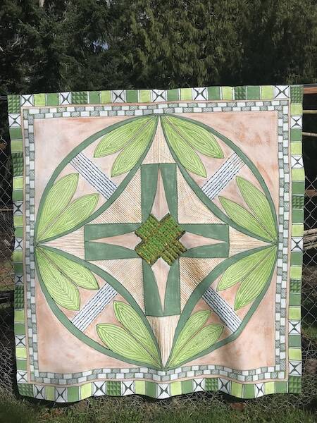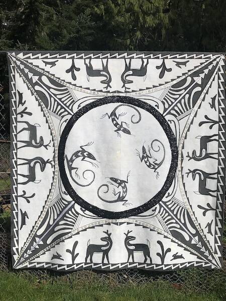Accompanying Lyla June’s talk at WICA are the inspirations of South Whidbey artist Doe Stahr, whose indigenous-inspired textiles have been displayed for events at universities and community colleges, for tribal leadership events, graduations and fundraising galas for social justice, nonprofits and political fundraisers. Stahr rents her “library” of banners, table covers and murals, which are steam-cleaned after they are used, rolled up and stored until the next event. Global cultures and events are her muse, and her collection continues to evolve and expand.