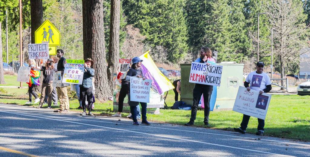 Monday, a group of South Whidbey middle and high school students walked out of school and gathered on the side of Maxwelton Road, holding signs and waving flags to show support for their LGBTQ+ peers. They were joined by parents and adult members of the community, including Jasper Taylor, a young man who organized the March 2 protest in downtown Oak Harbor.
