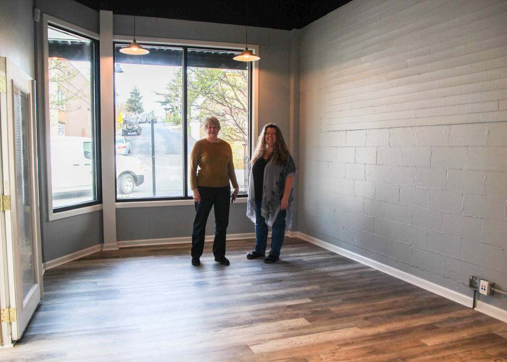 Margaret Livermore and Teresa Besaw stand in the approximately 225-square-foot business incubator at the Main Street Association’s new location on Pioneer Way.
