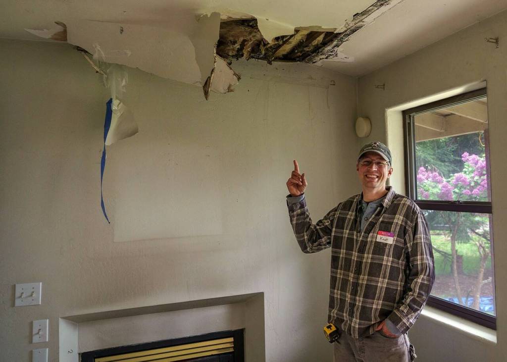 At another job site, volunteers repaired an upstairs deck with a “phantom” leak that damaged the living space downstairs. Below it, they replaced the drywall.