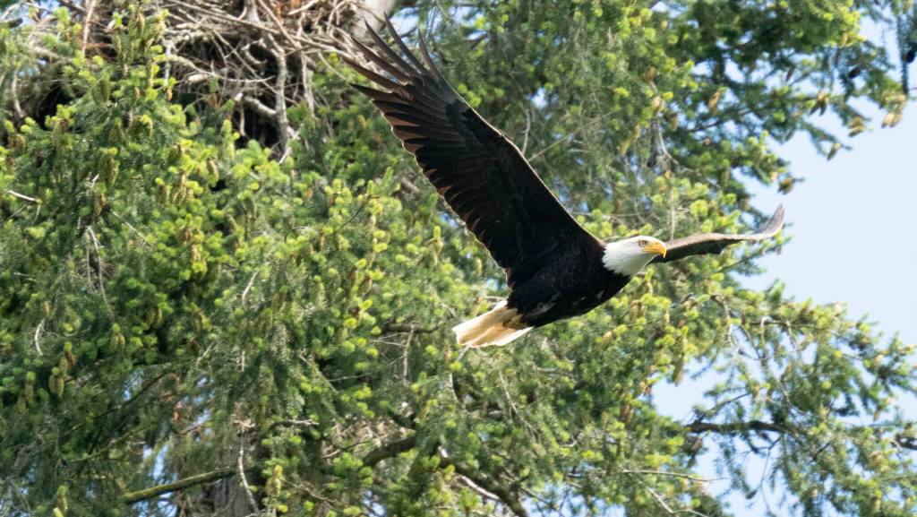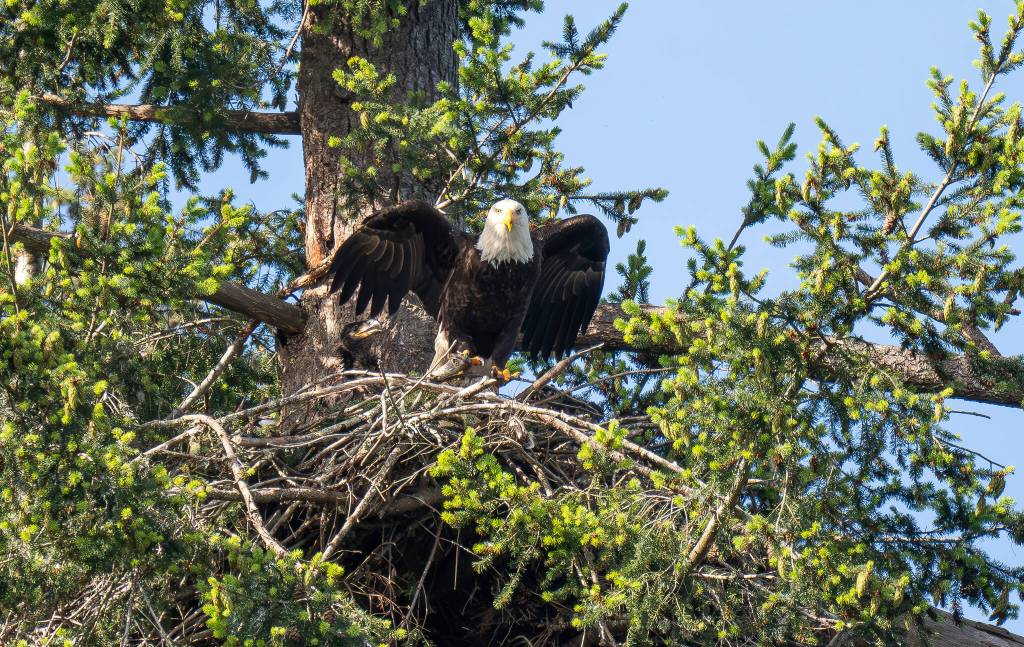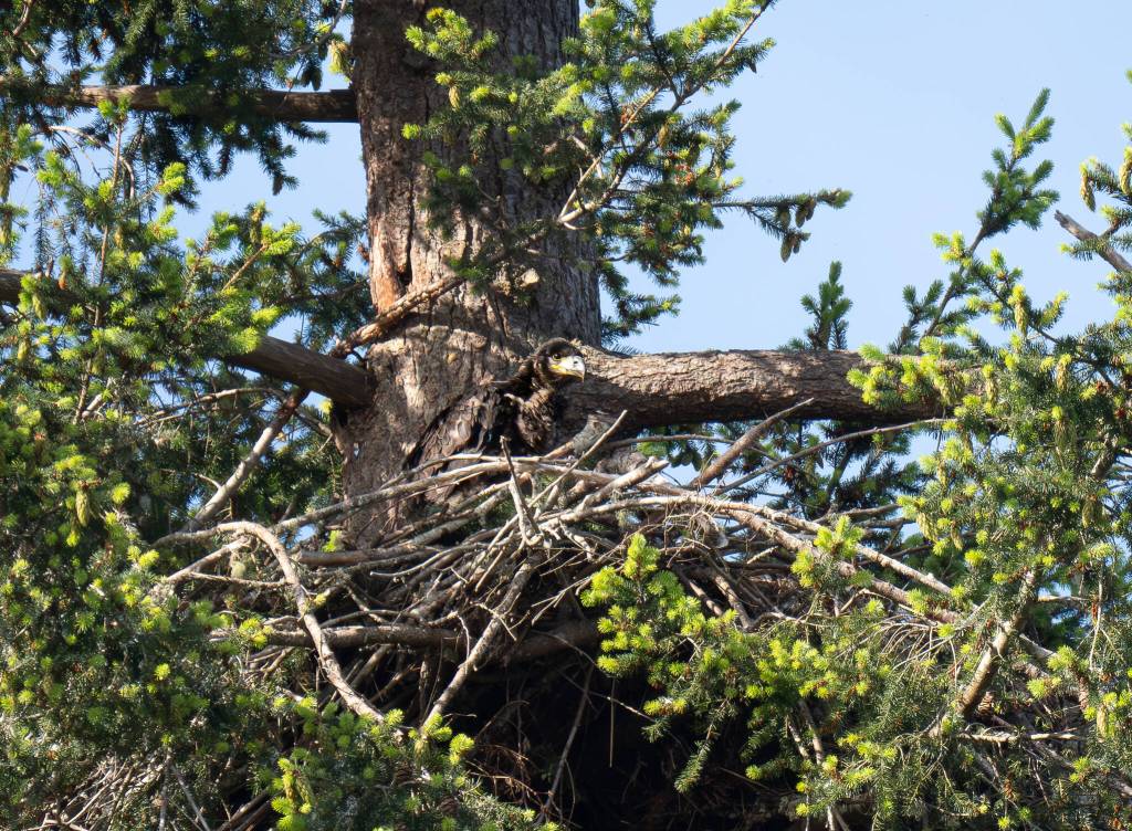 Last month, South Whidbey resident Linda LaMar photographed an eaglet in black juvenile plumage in a tree above her home on Goss Lake. Since then, her neighbors have spotted a second eaglet in the same nest. She estimated that the eaglets will be around 10 weeks old during Fourth of July celebrations, which according to the Audubon Society, is a critical time for fledglings that are just learning to fly.