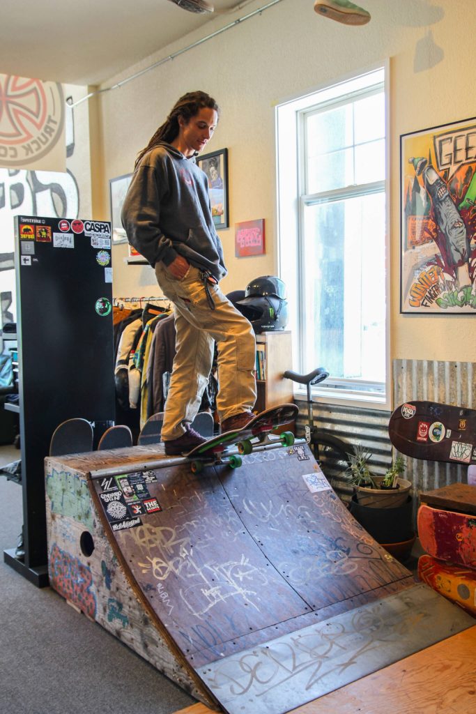 The name, “Geez Skate Shop,” comes from his own name, “‘G,’ or ‘Garrett’ for long,” he explained. He then stylized “G’s” into “Geez.”