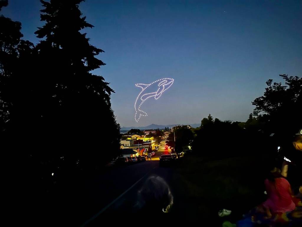 The 15-minute spectacle featured a hand waving at Camano Island and an animated blue heron, an acknowledgement of the Blue Heron Canoe Family, which is currently visiting Langley on their travels. The show was visible to all within a three-mile radius.