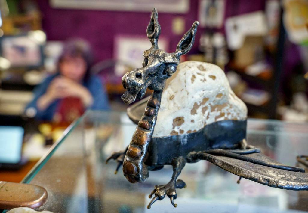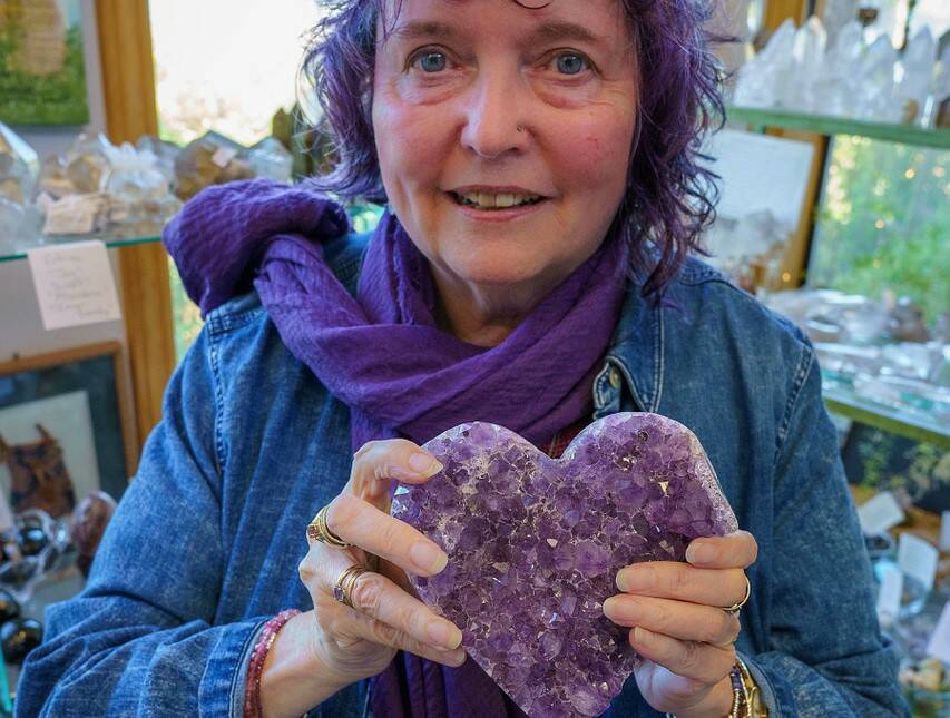 Amethyst from Turkey, quartz from Uruguay, volcanic glass from Arizona. Gnomes, dragons, angels, skulls. Onyx, pink, gold and so much purple, Carey’s favorite color. It’s even the same shade as her hair.