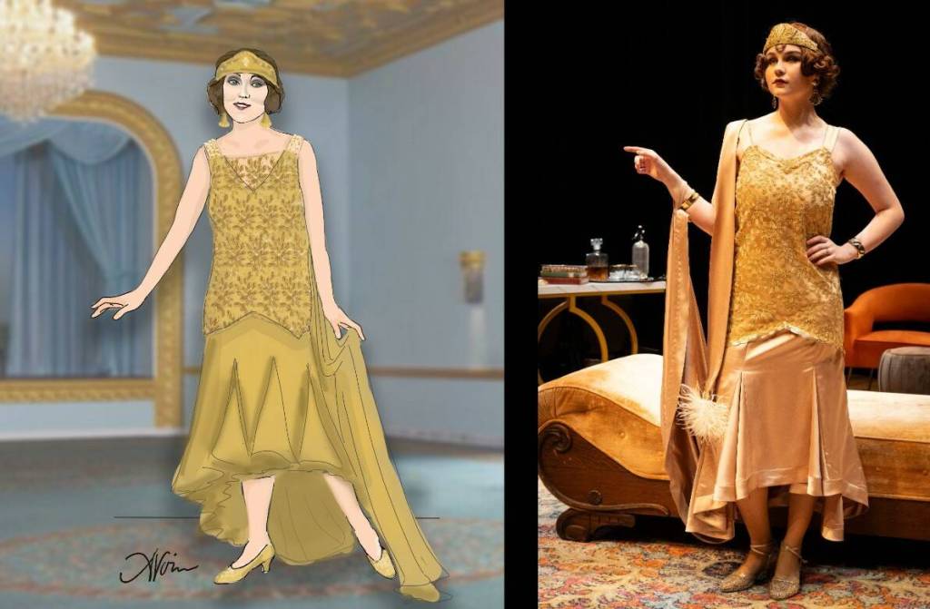 At left, Amalia Voiss’ rendering for one of the costumes in the play “Hay Fever.” At right, photographed by Sattva Photography, an actress wears the final result.