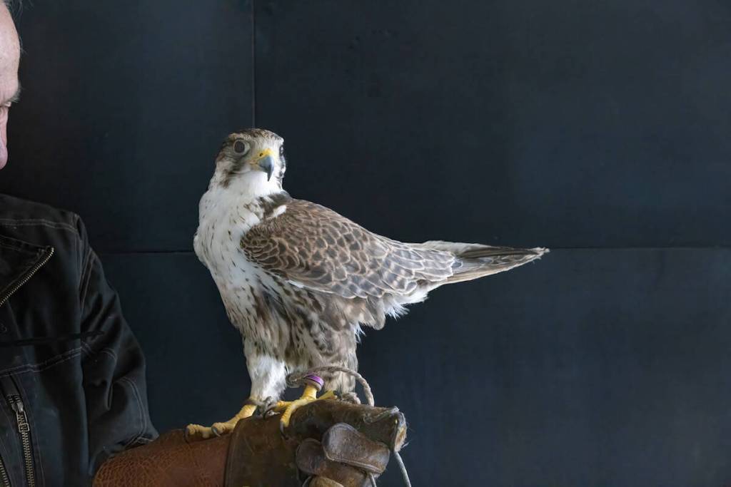 Layman agreed, saying the falcon’s hood “is a humane way to transport the bird from one place to the next. With this guy (Joe), I offer a hood and he knows it’s a nice, safe place.”