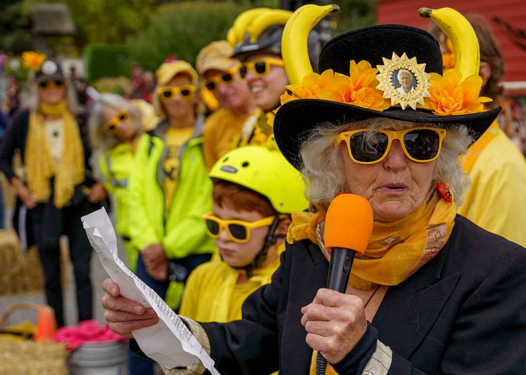 Her niece Jessica Standish and 8-year-old great-nephew Luca Pascual-Standish drove the car, as well as her 13-year-old neighbor Emile Lloyd. Yet the stars did not align that day for the Langley resident, who is an astrologer, to also race. Instead, Gretchen decided to distract with magnificent costumery, which included a hat with bananas and a picture of her father. At the end of the event, she read a poem Peter had written about the Soup Box Derby.