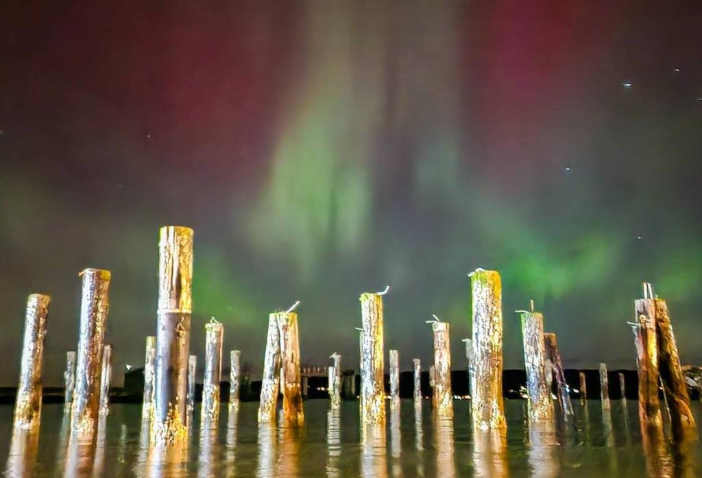 Cara Hefflinger, a wildlife photographer in Clinton, took this image of northern lights above the Langley Marina Thursday night. The dancing colors in the sky was due to unusually strong solar storms hitting Earth this week, producing aurora borealis father south than normal.