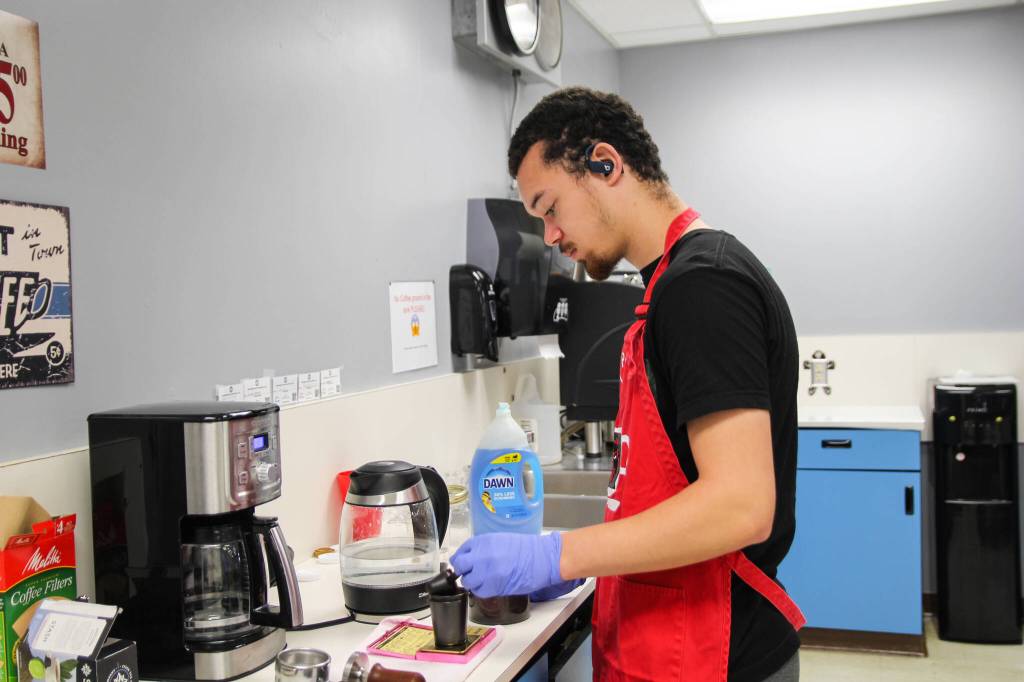 Dayvon Donavon, 19, makes coffee. On top of preparing drinks, students deliver orders and mail to staff around the district, order supplies and are in charge of the money. (Photo by Luisa Loi)