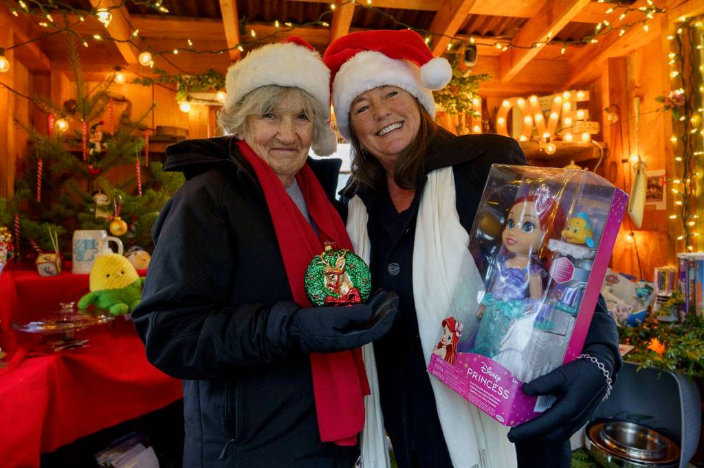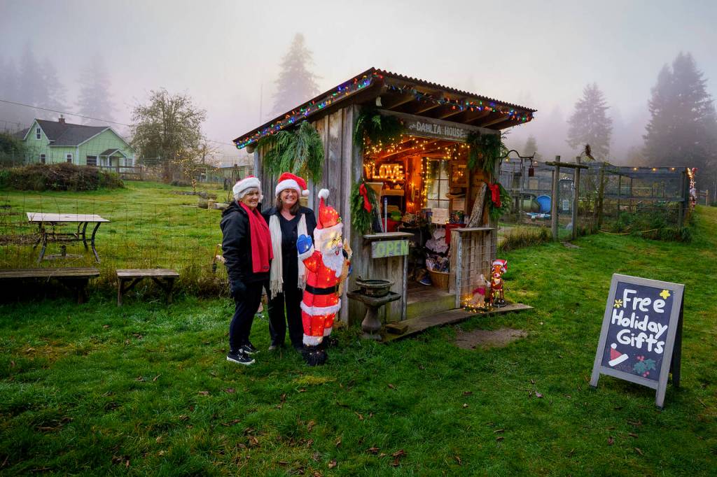 Tamara Knapp and her mother, Dorothy Anderson, transform the empty Dahlia House known for its colorful springtime and summertime blooms into the Christmas House. The little stand, decked out in colorful string lights, is filled to the brim with free holiday gifts.